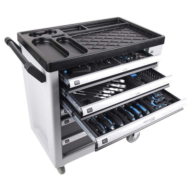 Professioneller Werkstattwagen für Hobby-Heimwerker sowie Profis. Mit dem Werkstattwagen von Fliegl erhalten Sie einen mobilen Werkzeugtisch inklusive sechs praktischen Schubladen mit einem professionellen 245-teiligen Werkzeugset von höchster Qualität.